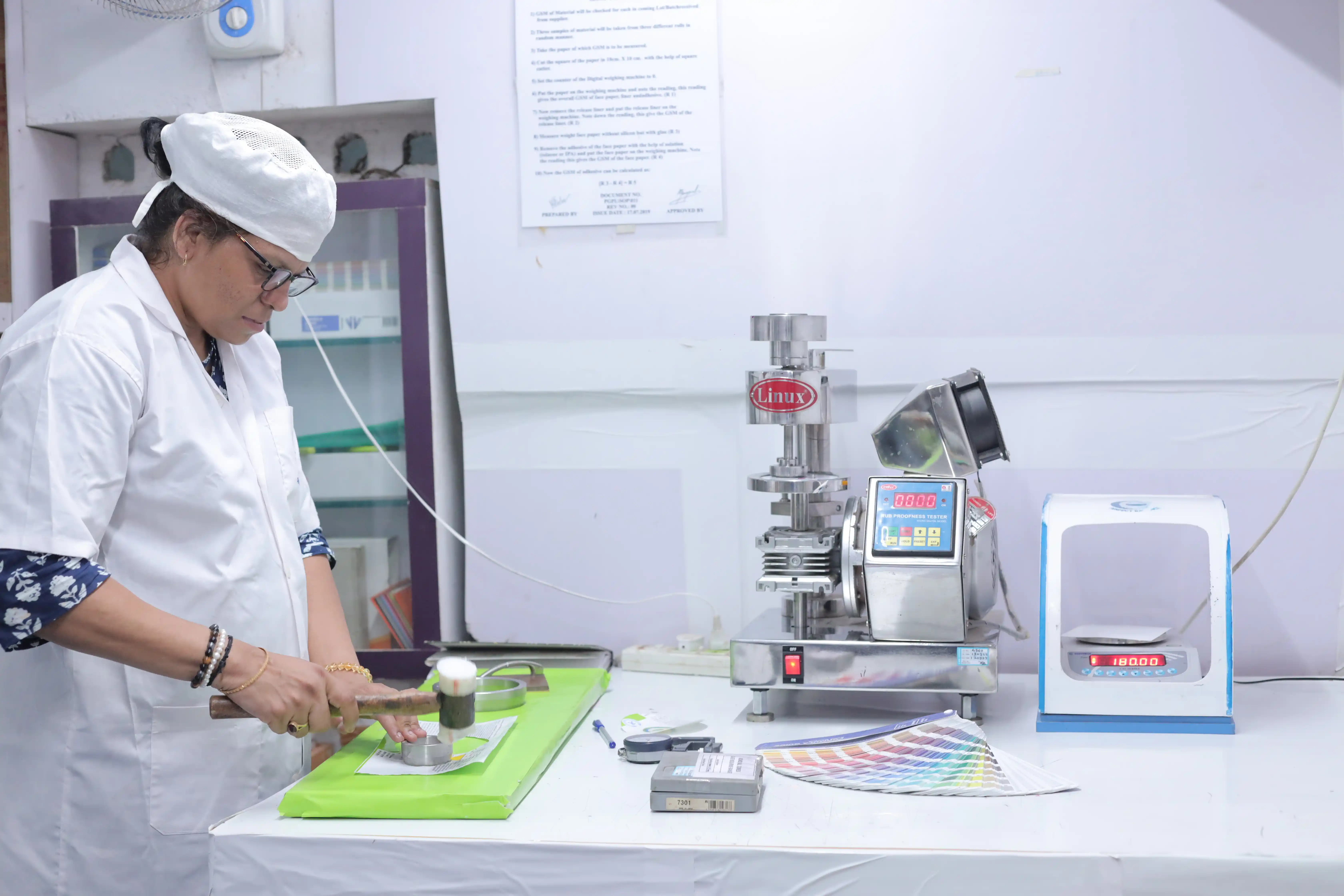 Advanced testing and inspection equipment for quality control, including color measurement, adhesion testing, and security feature verification.
